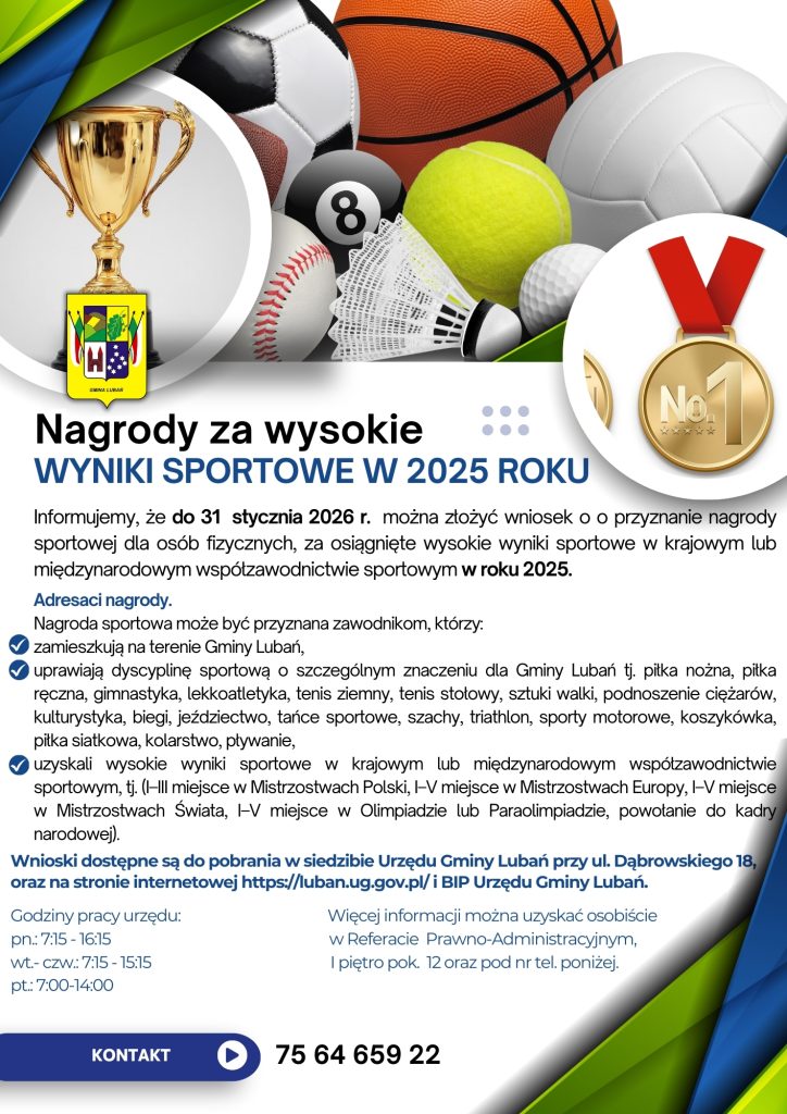 Informujemy, że do 31 stycznia 2026 r. można złożyć wniosek o o przyznanie nagrody sportowej dla osób fizycznych, za osiągnięte wysokie wyniki sportowe w krajowym lub międzynarodowym współzawodnictwie sportowym w roku 2025.