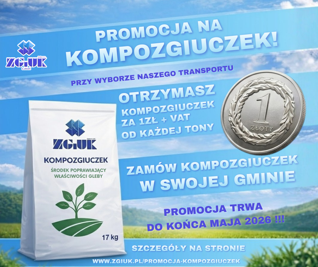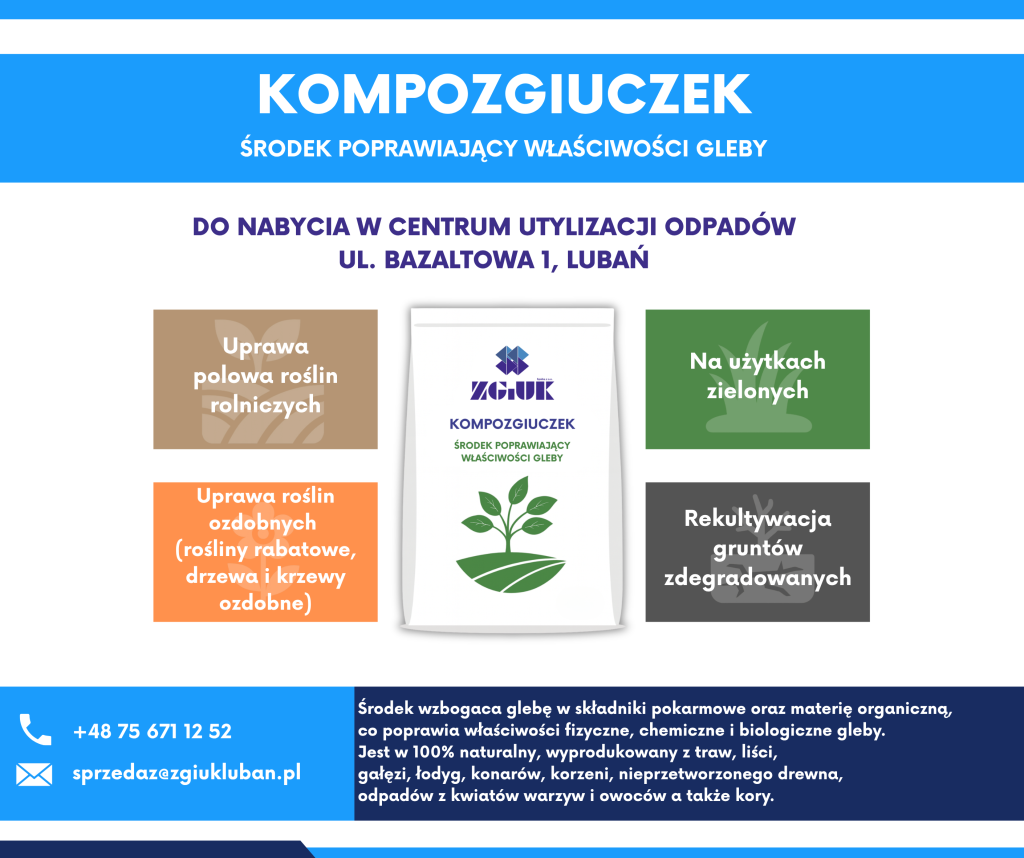 Zakład Gospodarki i Usług Komunalnych w Lubaniu zaprasza do udziału w akcji promocyjnej Kompozgiuczek. Jest to środek poprawiający właściwości gleby jest powstałym w procesie kompostowania selektywnie zbieranych bioodpadów, tj.: trawy, liści, łodyg, gałęzi, korzenieni, nieprzetworzonego drewna, odpadów z kwiatów, warzyw, owoców, kory a także zrębków drzewnych w ilości ok. 90%, z dodatkiem odpadów drewna i papieru- w ilości 10 %. Szczegóły na plakatach.