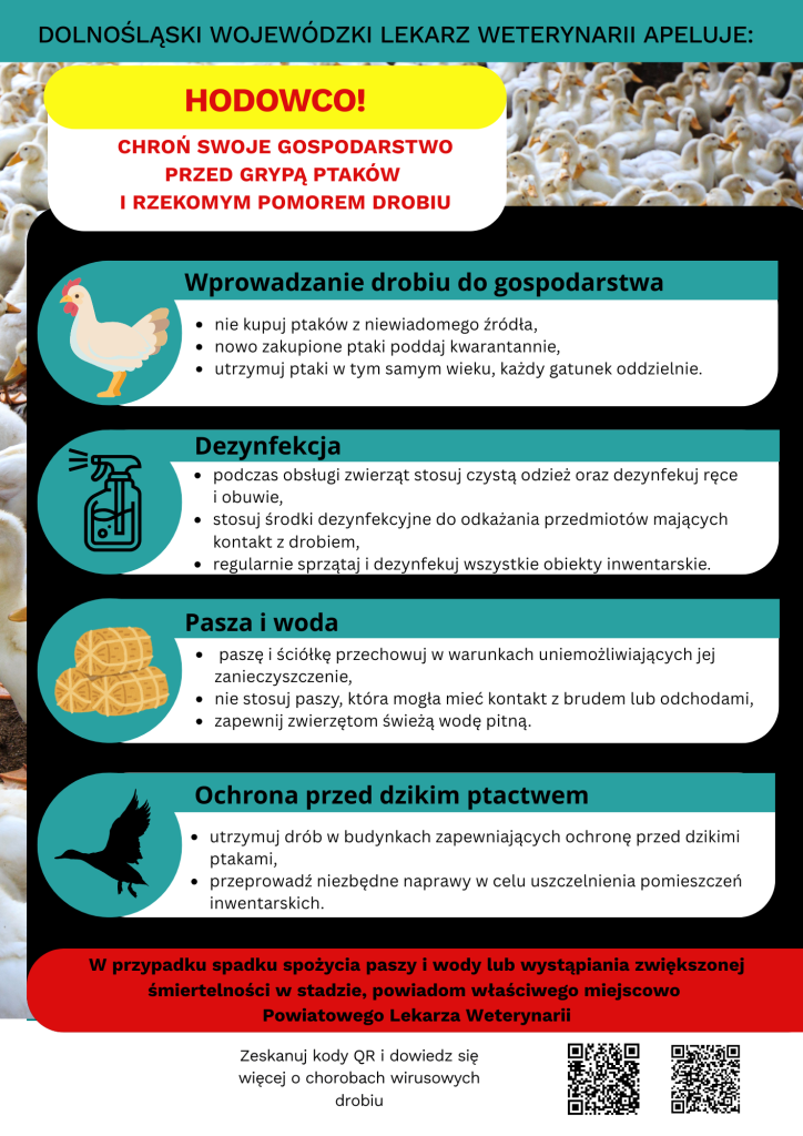 W załączeniu ulotka dotycząca informacji dla hodowców/właścicieli drobiu o chorobach zakaźnych drobiu obecnie występujących w Polsce oraz obowiązków, które z tego płyną.