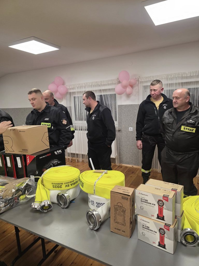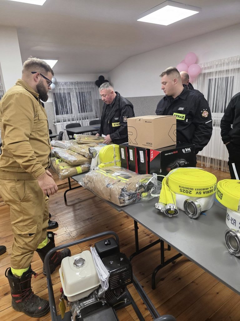 OSP Pisarzowice: ubranie specjalne 2-częściowe, buty strażackie skórzane, hełm strażacki oraz węże tłoczne do motopompy,