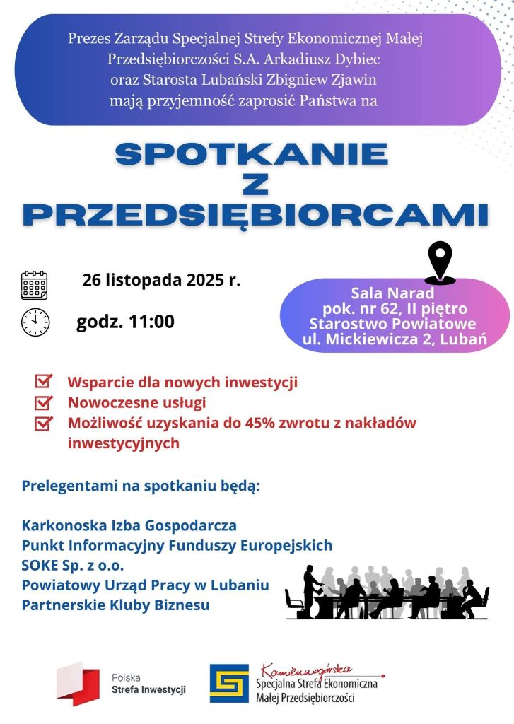 Prezes Zarządu Specjalnej Strefy Ekonomicznej Małej Przedsiębiorczości S.A. Arkadiusz Dybiec oraz Starosta Lubański Zbigniew Zjawin zapraszają lokalnych przedsiębiorców na spotkanie informacyjne, które odbędzie się 26 listopada 2025 r. (środa) o godz. 11:00 w sali narad Starostwa Powiatowego w Lubaniu.