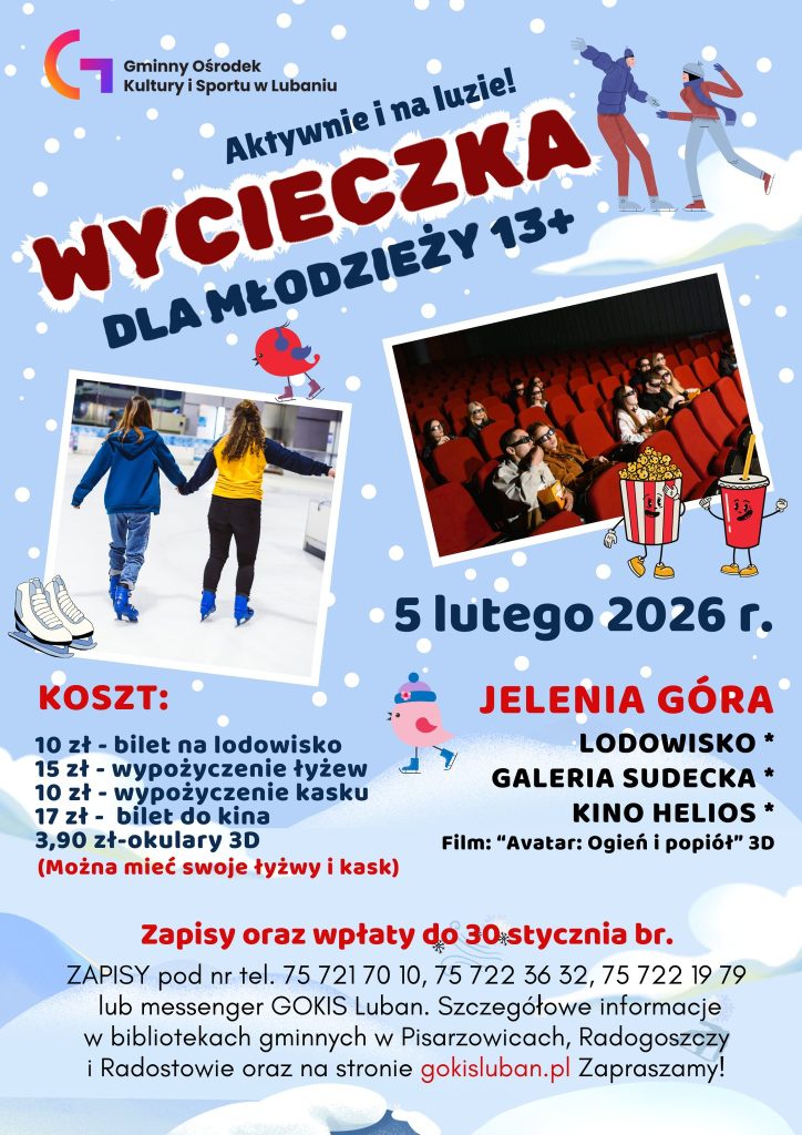 Gminny Ośrodek Kultury i Sportu w Lubaniu zaprasza młodzież w wieku 13+ na zimową wycieczkę pełną ruchu i dobrej zabawy. W programie wyjazdu zaplanowano lodowisko, wizytę w Galerii Sudeckiej oraz seans filmowy w Kinie Helios. Uczestnicy obejrzą film „Avatar: Ogień i popiół” w technologii 3D.