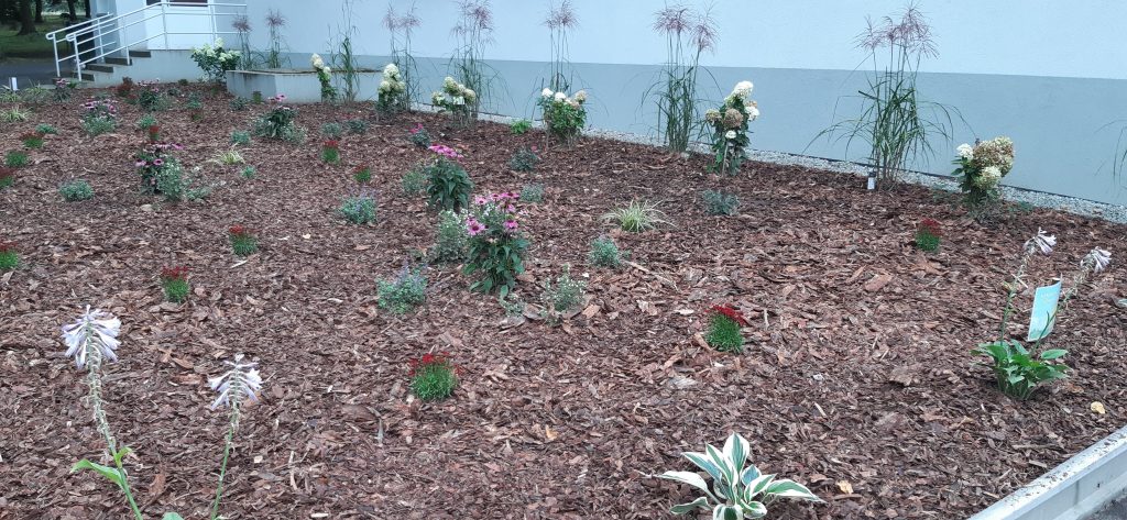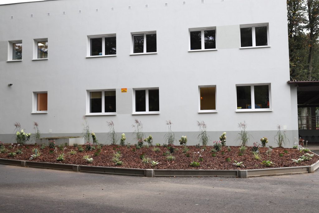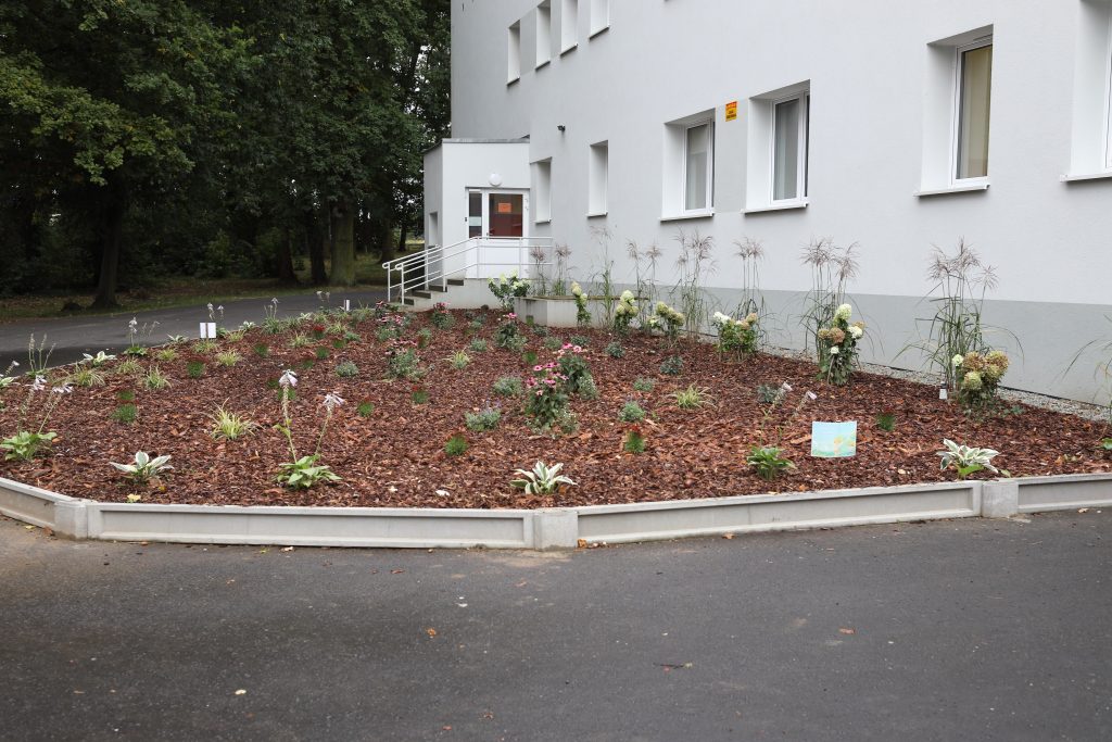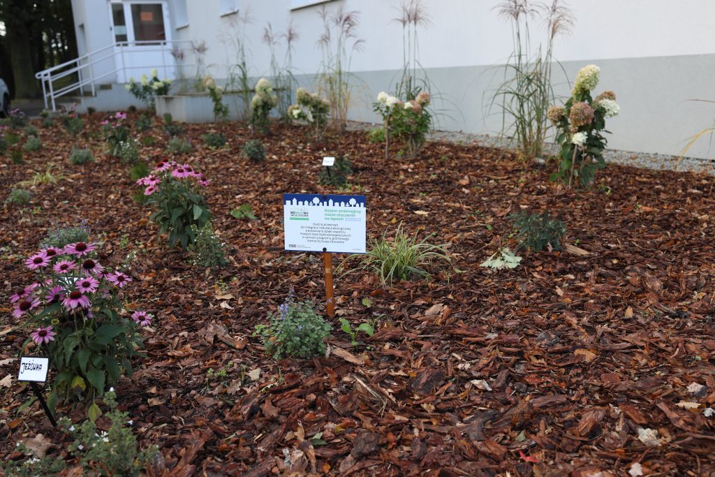Przy budynku przedszkola powstała przyjazna przestrzeń z roślinami miododajnymi i oczyszczającymi powietrze oraz przyjazna rabata z krzewami,