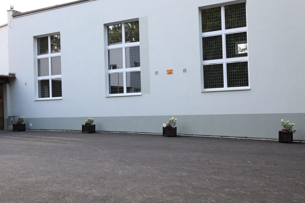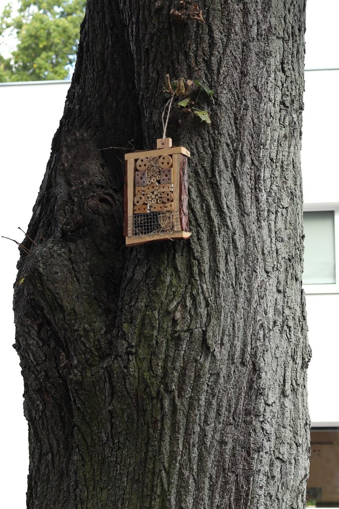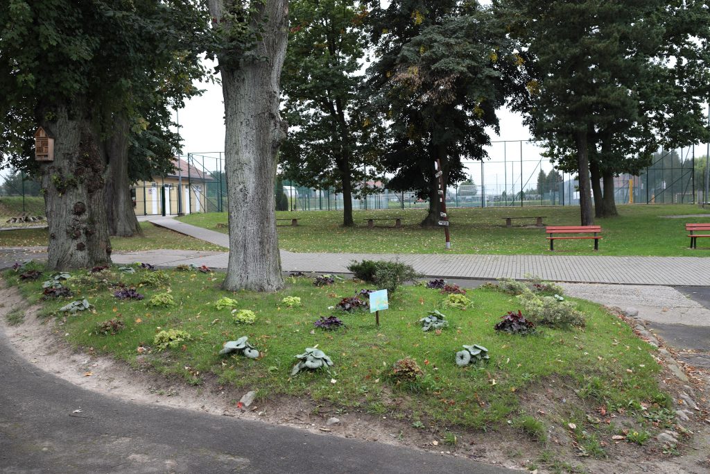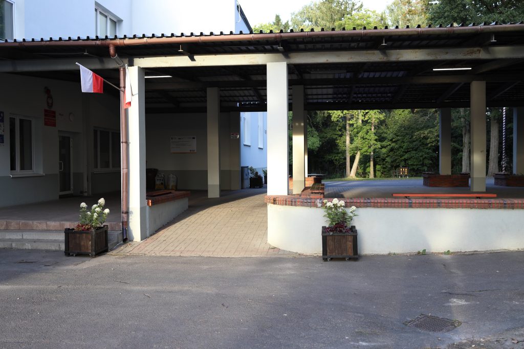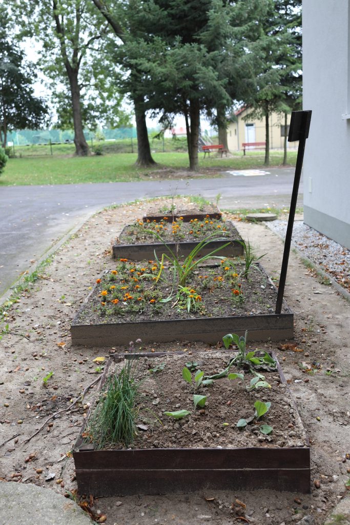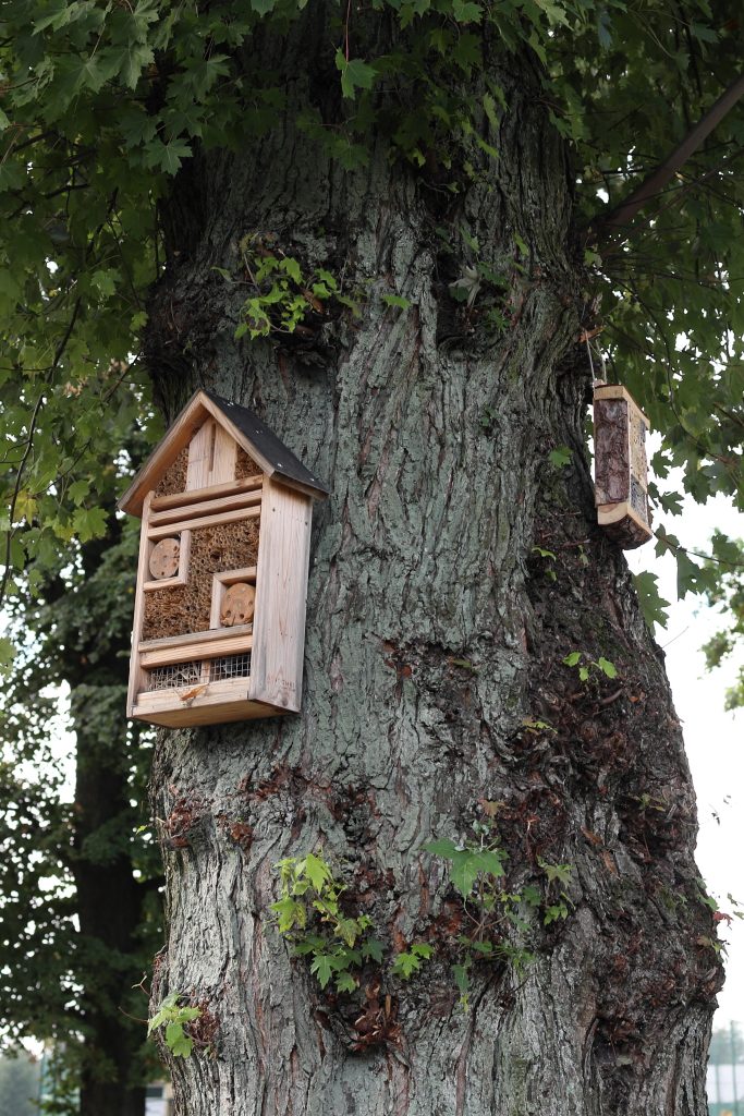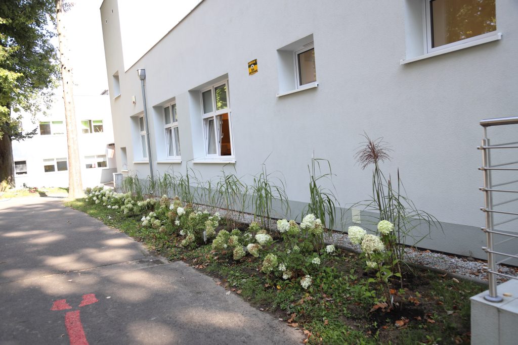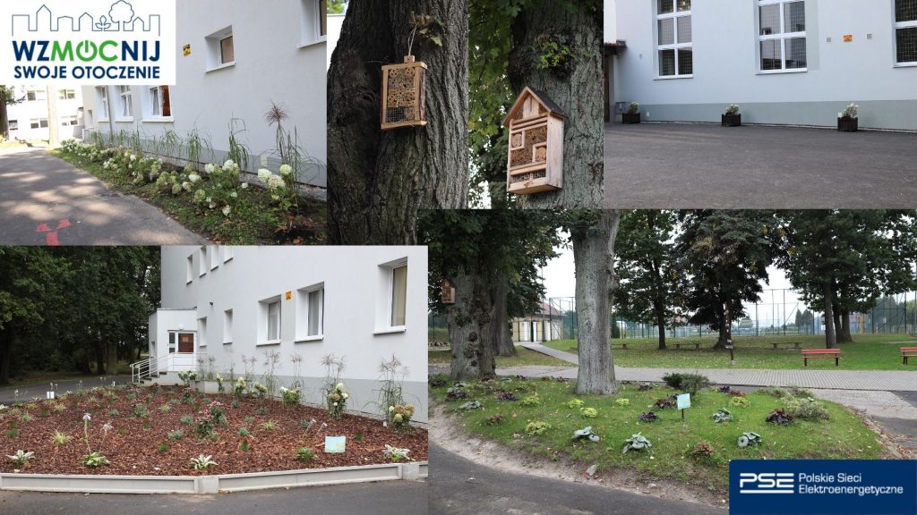 a pod drzewami przed szkołą została stworzona zielona wyspa i zawieszone domki dla owadów. Plac apelowy ozdobiły zaś krzewy w donicach.